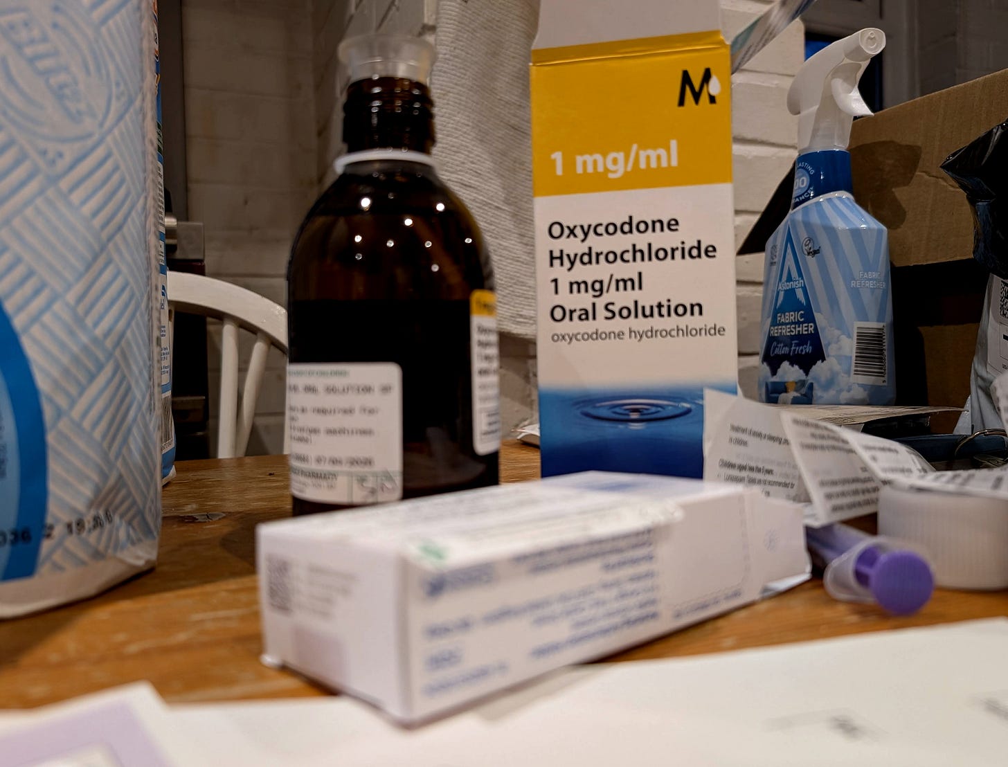 I rifled through medicine bags in the kitchen and did her a full dose of oxycodone (painkiller) and a syringe of anti-sickness medication, just in case she was queasy and not able to articulate it. At this point, I was so knackered I’d have happily performed a one-man Hamlet show if it meant she’d let me sleep for an hour.