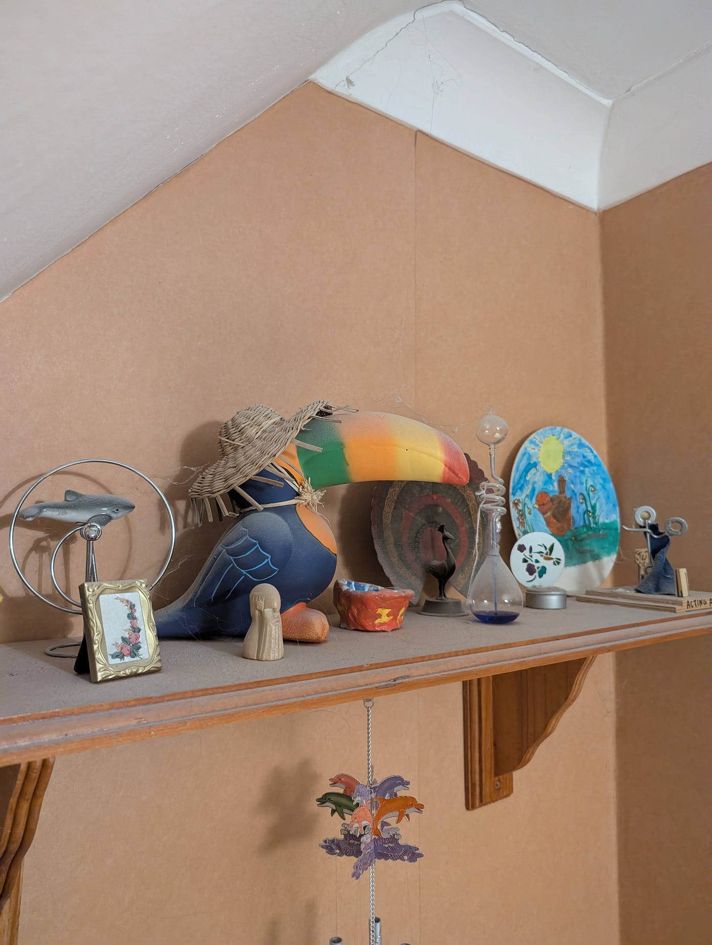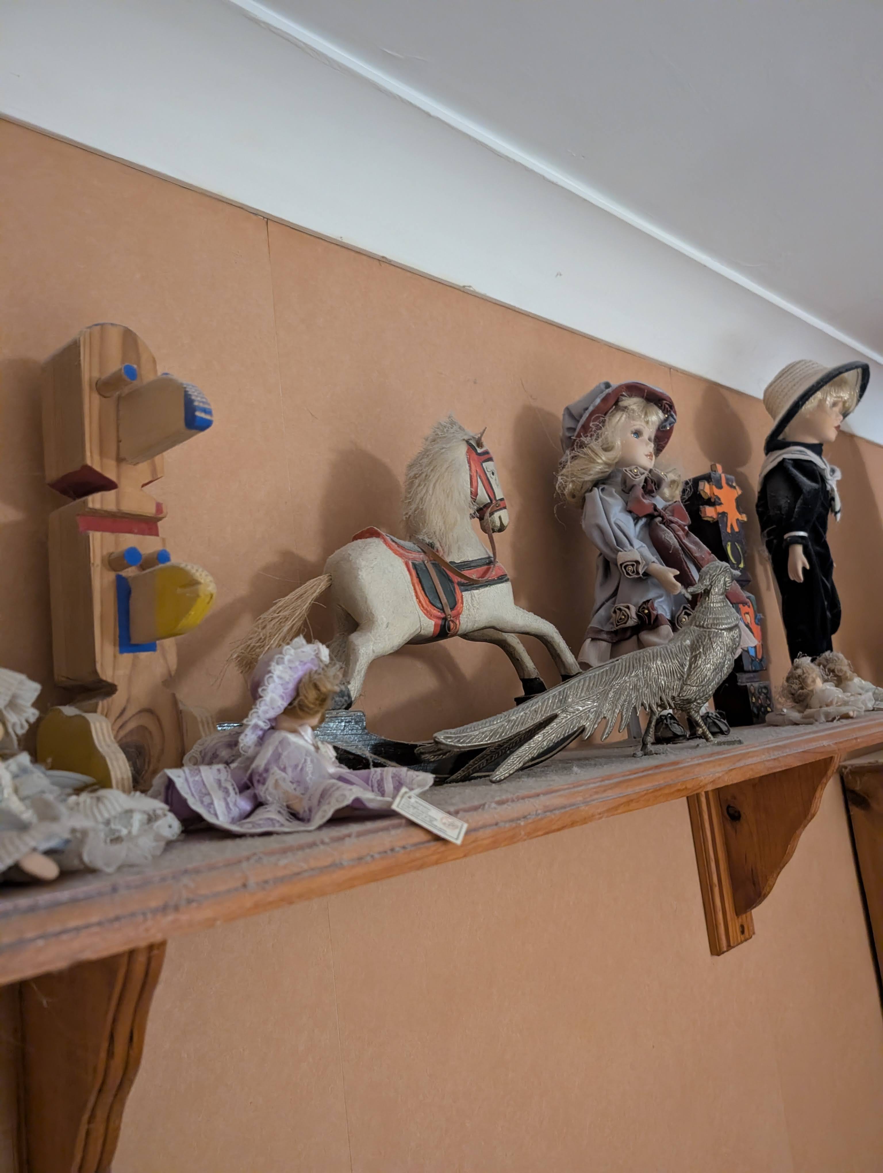 A tacky model of a dolphin we had brought back from a holiday with Dad in France. Two little wooden totem poles we made in Design Technology at school. A little clay bowl I’d made as a seven-year-old, emblazoned with “I love you” in yellow paint, that for a while she used as an ash tray. A couple of tiny porcelain dolls I’d given her for some birthday long passed, and – oddly – a small model rocking horse Dad bought her soon after she left him.